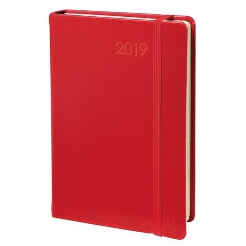 Agenda giornaliera 12 mesi da gennaio a dicembre, 13x21 cm. Carta avorio certificata PEFC, rivestimento similpelle rosso ciliegia e chiusura con elastico.