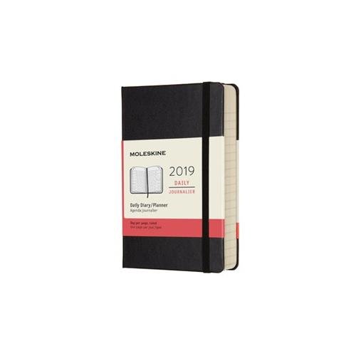 L'agenda giornaliera Moleskine copre tutto l’anno, da gennaio a dicembre; formato pocket, colore nero. Numero pagine: 400. Ogni sua pagina è dedicata a un singolo giorno. Copertina rigida con angoli arrotondati. Chiusura ad elastico, nastrino segnalibro e tessuto della tasca espandibile interna dello stesso colore della copertina. Include 3 foglietti di adesivi. Carta color avorio da 70 g/mq. Strumenti utili: planning, fusi orari, misure internazionali, prefissi internazionali e durate dei voli. Etichetta “in case of loss” stampata nel risguardo. Apertura a 180°.
