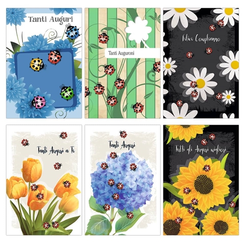 Biglietti augurali in fantasie assortite. Ideali per augurare un buon compleanno. Formato 12 x 18 cm. Fantasia coccinelle. Confezione da 6 pezzi assortiti.