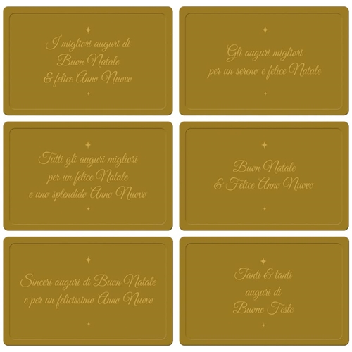 Biglietti Natalizi in vassoio, in cartoncino oro con busta e scritta oro. Formato 9x14 cm, confezione da 6 pezzi.
