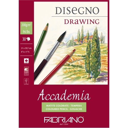Blocco da disegno linea Accademia, collato in testa prodotto con il 100% di cellulosa ECF, certificata FSC secondo rigorosi standard ambientali, sociali ed economici. Idoneo per carboncino, matita, pastello, sanguigna. Formato A3, blocco da 50 fogli.