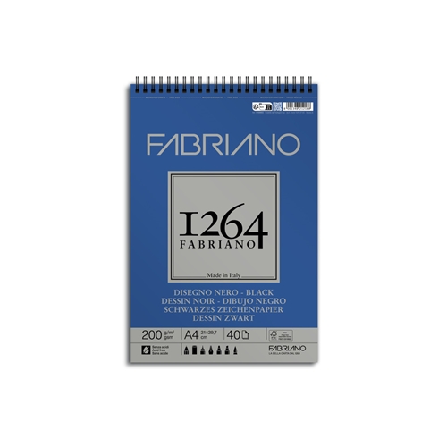 Blocco da disegno spiralato Fabriano 1264, la carta da disegno nera presenta una superficie ruvida che trattiene i pigmenti. Permette di realizzare dei brillanti disegni in bianco e nero e rinforza i contrasti dei disegni colorati. I fogli sono microperforati con formato reale dopo lo strappo. Carta certificata FSC, Acid Free. Carta da 200 grammi, blocco composto da 40 fogli. Formato A4.