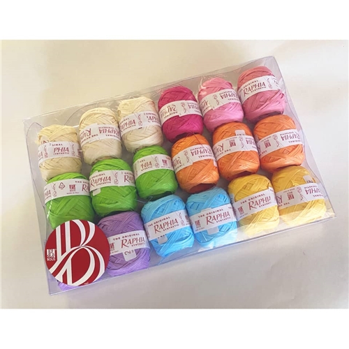 Confezione composta da 18 bobine da 20 metri di raphia synthetic. Assortimento composto da 2 pezzi per colore: giallo, azzurro, lavanda, arancio, verde, rosa, magenta, avorio e rosa fluo.
