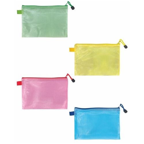 Busta chiusura a zip con cordino colorato. Realizzato in PP e rete nel formato 33x23 cm. Assortita in 4 colori.