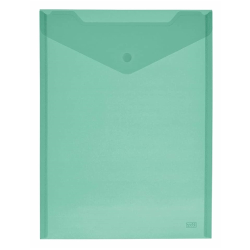 Busta trasparente in PP con chiusura a bottone. Confezione da 12 pezzi in 4 colori assortiti: trasparente neutro, giallo, blu e verde. Formato A7, apertura verticale.