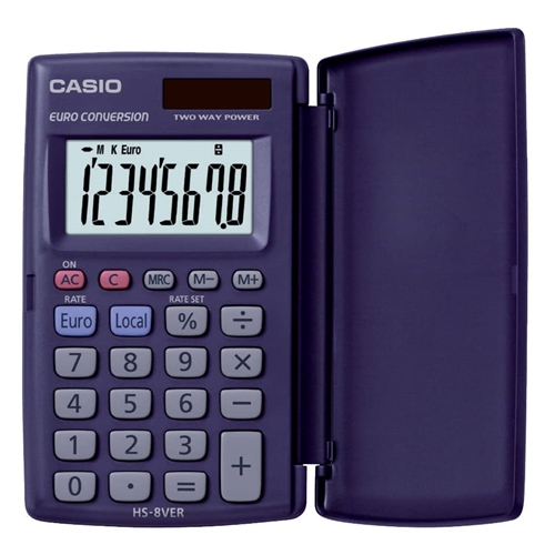 La calcolatrice tascabile HS-8VER Casio a 8 cifre è uno strumento compatto dotato di custodia protettiva, pratica e ideale per i calcoli semplici. È dotata di EXTRA BIG LC-display a 8 cifre e alimentata sia ad energia solare sia a batteria LR54.