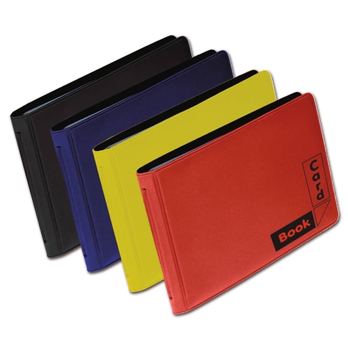 Cardbook a 12 scomparti con disposizione a libro in PVC gommato e anima semirigida. Interi in PVC antistatico, stampa a caldo. Colori assortiti.