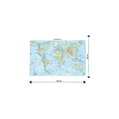 La carta scolastica da banco del Mondo in formato A3 è stampata su entrambi i lati. Un lato rappresenta l’aspetto fisico della terra su un lato e quello politico dall’altro. L’uso dei colori è bilanciato per salvaguardare sia la brillantezza che la leggibilità della carta. Le città si distinguono per grandezza con una simbologia appropriata. Nella parte fisica emerge la conformazione dei sistemi montuosi e dei fondali marini grazie a una scala di colori armonica che non disturba la leggibilità. Plastificata per fornire la massima protezione, è economica e duratura, ideata specificatamente per l’uso nelle scuole. Carta da banco del Mondo, formato 42 x 30 cm (A3).