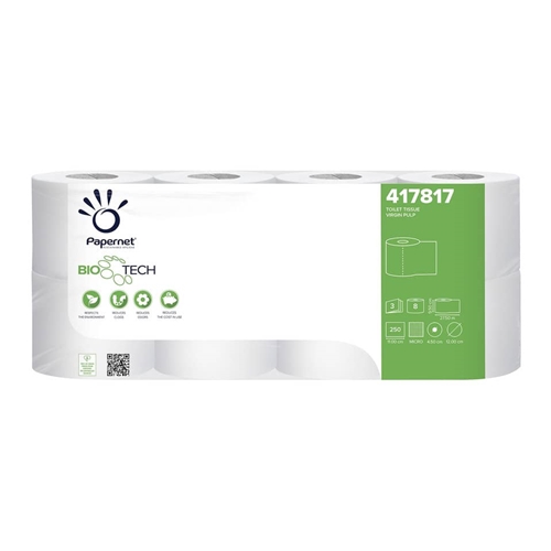Carta Igienica Bio Tech in pura cellulosa a 3 veli bianca. Lunghezza rotolo 27,5 metri per 250 strappi. Bio Tech utilizza la tecnologia Biologic Active Tissue Paper in esclusiva europea. Riduce i cattivi odori e gli effetti dello sporco. E' un' innovativa carta igienica contenente 5 tipologie di microrganismi naturali (innoqui per l'uomo e per l'ambiente) che, attivandosi con il contatto con l'acqua, producono enzimi che si nutrono delle incrostazioni e delle sostanze organiche presenti nelle tubature. Confezione da 7 pacchi da 8 rotoli ciascuno.