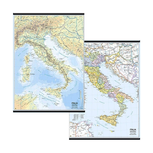 Carte murali scolastiche per la didattica, grazie alla cartografia basata sulla proiezione conforme di Gauss-Boaga rappresenta l’aspetto fisico dell’Italia da un lato e quello politico dall’altro. Il taglio comprende l’intero bacino dell’Adriatico. Nella parte fisica emerge la conformazione dei sistemi montuosi e dei fondali marini grazie a una scala di colori armonica che non disturba la leggibilità. La toponomastica semplificata, oltre a definire i principali elementi geografici, cura in particolare la delimitazione delle catene montuose con i relativi passi e si estende agli specchi d’acqua e alle regioni fisiche minori. Grazie alla speciale plastificazione opaca antiriflesso è garantita un’ottima leggibilità in ogni condizione di luce. Cartina dell'Italia, formato 97 x 134 cm.