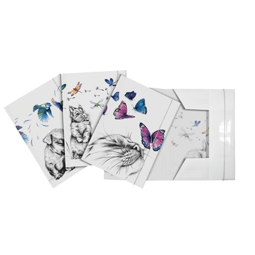 Cartella a 3 lembi Icon Friends con elastico tondo, formato A4 (33 x 23,7 cm). Tre soggetti assortiti.