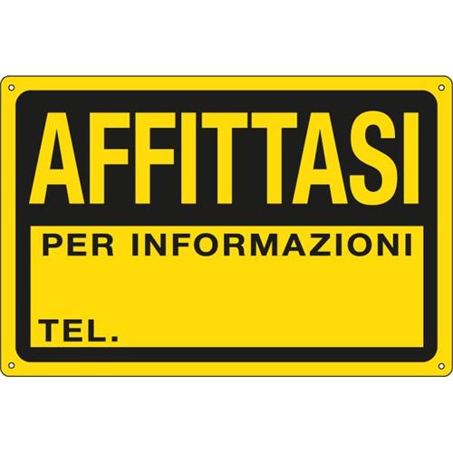 Cartello di comunicazione affittasi - Tipologia: Comunicazione - Materiale: plastica pvc - Messaggio: affittasi per informazioni tel. - Dimensioni: 300x200 mm