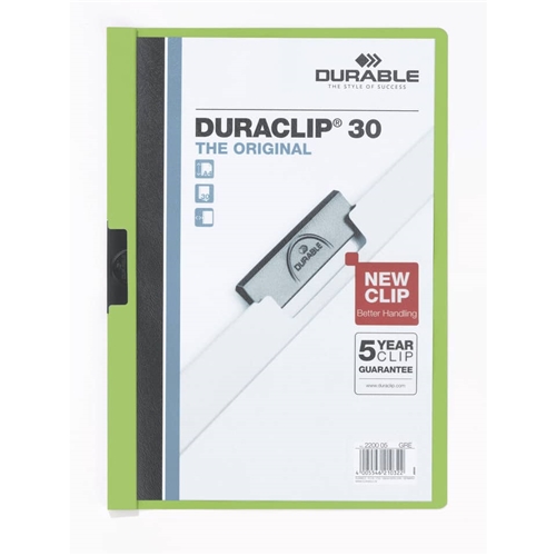 L'originale cartellina con clip inventata e brevettata da DURABLE nel 1959 e prodotta in Germania. Cartellina realizzata in PVC di alta qualità con clip in acciaio, copertina trasparente e retro colorato. La clip si adatta al numero di fogli inseriti e il suo perfetto funzionamento è garantito 5 anni. Ideale per presentare e archiviare, in modo professionale, documenti non perforati: tira la clip - inserisci i documenti - riposiziona la clip - semplice! Con DURACLIP® i tuoi fascicoli avranno sempre un aspetto professionale, ordinato e organizzato. Capacità 1-30 fogli formato A4. Colore verde.