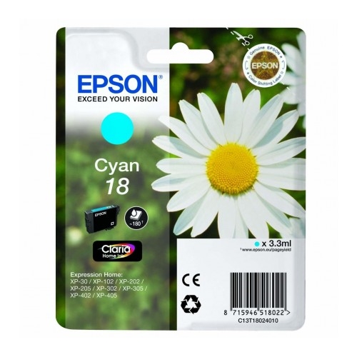 Cartuccia originale inkjet Epson 18, della serie margherita, di colore ciano e dalla durata di 180 pagine.
