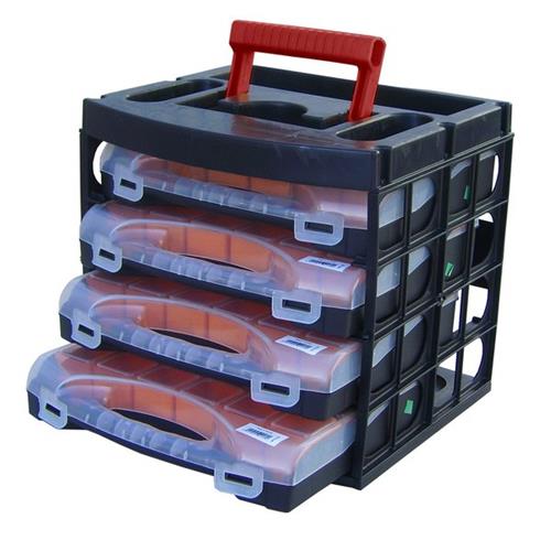Cassettiera da lavoro componibile in polypropilene, composta da 4 cassetti removibili e portatili. L'alveolo trasparente consente di mantenere al sicuro i prodotti durante il trasporto.