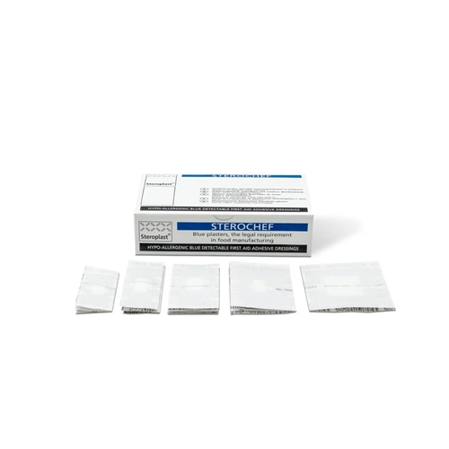 I cerotti blu detectable sterili PVS Sterochef sono ideali per industrie alimentari. Il cerotto è dotato di una banda metallica all'interno che consente l'eventuale rilevazione tramite appositi dispositivi. Conformi HACCP. Confezione da 100 pezzi, misure assortite: 20 pz 9x72 mm; 40 pz 30x72 mm; 32 pz 55x18 mm; 4 pz farfalla; 4 pz 72x50 mm.