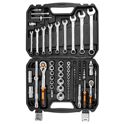 Il set di chiavi a bussola NEO 1/2" e 1/4" (rif. 10-058) è composto da 82 elementi, realizzati in acciaio al cromo vanadio di alta qualità. Il set comprende cricchetti 1/2" e 1/4". (meccanismo a cricchetto durevole - 90 denti) con maniglie piegate ed ergonomiche. Il set comprende un ampio pacchetto di prese esagonali con scritte in rilievo (nelle misure da 4 a 32 mm) e punte di cacciavite (piatte, a croce, esagonali, Torx). Inoltre, la valigetta contiene chiavi combinate (9 pezzi, 8mm - 22mm). Questo è completato da una vasta gamma di accessori. La disposizione verticale degli elementi nella cassa permette di completare più rapidamente il set necessario. Le chiavi sono fornite in una pratica e robusta custodia in plastica con chiusure in metallo e una comoda maniglia. L'affidabilità del prodotto è confermata dalla garanzia di 25 anni e dal certificato M+T del TÜV Rheinland. Il marchio NEO soddisfa le aspettative dei professionisti.