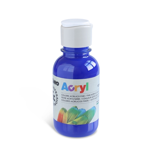 Colore acrilico fine in bottiglia in PET da 125 ml, con tappo dosatore. È un colore ad acqua ad alta concentrazione di pigmento ed emulsione acrilica, di alta qualità, opaco e molto coprente che una volta asciutto è permanente. Si stende facilmente e asciuga in bella superficie rimanendo elastico, di tono vivo e luminoso, piacevole al tatto e resistente. È utilizzabile su qualsiasi substrato, si presta bene alle attività pittoriche proprie di questa tecnica versatile e ricca di possibilità creative. È adatto a tecniche decorative e hobbistiche quali il découpage. È applicabile sulle pareti mediante stencils. I risultati sono di ottimo effetto e durata. Le tinte disponibili in gamma utilizzate pure offrono colori intensi e d’effetto. Colore blu oltremare.