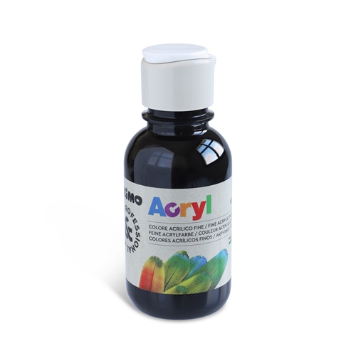 Colore acrilico fine in bottiglia in PET da 125 ml, con tappo dosatore. È un colore ad acqua ad alta concentrazione di pigmento ed emulsione acrilica, di alta qualità, opaco e molto coprente che una volta asciutto è permanente. Si stende facilmente e asciuga in bella superficie rimanendo elastico, di tono vivo e luminoso, piacevole al tatto e resistente. È utilizzabile su qualsiasi substrato, si presta bene alle attività pittoriche proprie di questa tecnica versatile e ricca di possibilità creative. È adatto a tecniche decorative e hobbistiche quali il découpage. È applicabile sulle pareti mediante stencils. I risultati sono di ottimo effetto e durata. Le tinte disponibili in gamma utilizzate pure offrono colori intensi e d’effetto. Colore nero.