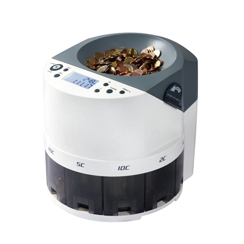 Conta dividi valorizza monete Euro a 8 cassetti.Funzione batch (impostazione del numero di pezzi da conteggiare).Report di conteggio a display e stampabile.Capacità di carico: 1.000 monete - capacità cassetti 100/400 monete.Dimensioni mm 394x370x376.