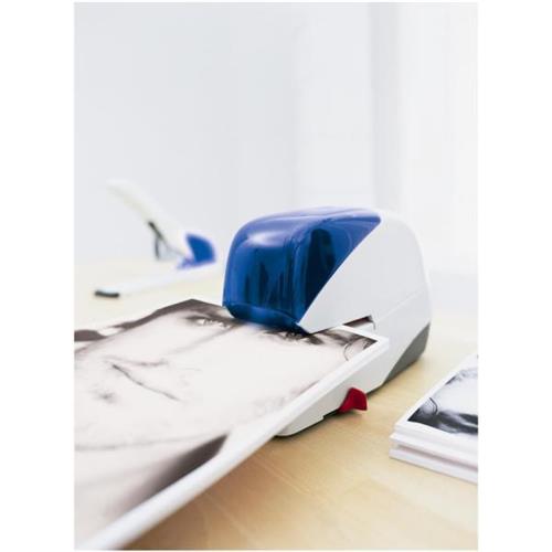 Cucitrice elettronica con cartuccia di caricamento (5000 punti. adatta a tutti gli spessori). Garantita per 500.000 cuciture (le parti usurabili vengono sostituite con la nuova cartuccia). Profonfità di cucitura regolabile per un risultato preciso da 2 a 80 fogli alla volta. Caricamento rapido. Indicatore rosso di richiesta nuova cartuccia ben in anticipo rispetto all'esaurimento punti. Estremamente silenziosa. Vibrazioni ridotte. Una cartuccia inclusa.