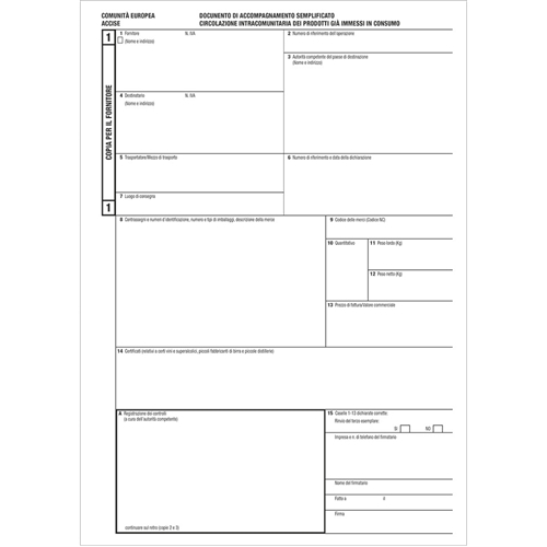 D.A.S. - Documento d'accompagnamento semplificato circolazione intracomunitaria prodotti già immessi in consumo - snap a 3 copie - carta chimica. Documento da 100 fogli.