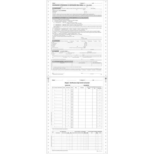 Mod. 4 - ( Bianco-8870R0000 ) Dichiarazione di provenienza degli animali da allevamenti - modulo continuo a 4 copie - carta chimica. Il nuovo modello non è più riconoscibile per la stampa colorata ma sarà il compilatore a scrivere sullo stesso il colore che identifica il tipo di provenienza/destinazione ( Rosa: da allevamenti - Giallo: da centri di raccolta, fiere, mercati o esposizioni - Verde: da stalle di sosta). Il nuovo modello sostitusce anche il documento di accompagnamento al macello di volatili, conigli, selvaggina d'allevamento.
