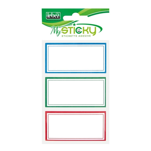 Etichette adesive con bordo, adatte per la scuola. 10 Confezioni composte da 18 etichette ciascuna, in tre colori assortiti: verde, rosso e azzurro. Formato 7 x 3,5 cm.