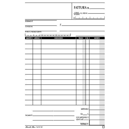 Blocco fatture 1 aliquota fogli autocopianti in carta chimica. Formato 148x215 mm.