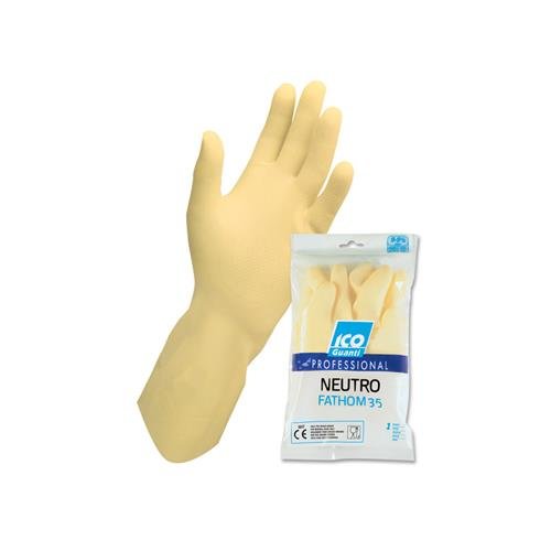 Guanti riusabili in lattice di gomma naturale clorinato interno/esterno di forma anatomica per mano destra e sinistra, senza felpatura. Bordino arrotolato di finitura. Lavabile internamente. Dispositivo medico di 1^ classe. Spessore 0,25 mm. Confezione da 1 paio.