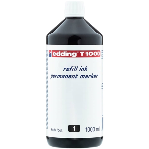 Inchiostro per ricarica marcatori permanenti nero. Inchiostro per ricarica per ricaricare grandi volumi di vari marcatori permanenti edding. La ricarica in flacone ha un volume di 1000 ml. L'inchiostro per ricarica T 1000 è adatto anche per un applicazione diretta con pennelli, penne, stancil e timbri. Senza aggiunta di xylene o toluene.