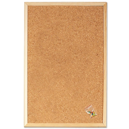 Lavagna in sughero con cornice in legno naturale. Completa di spilli. Formato 60x90 cm.