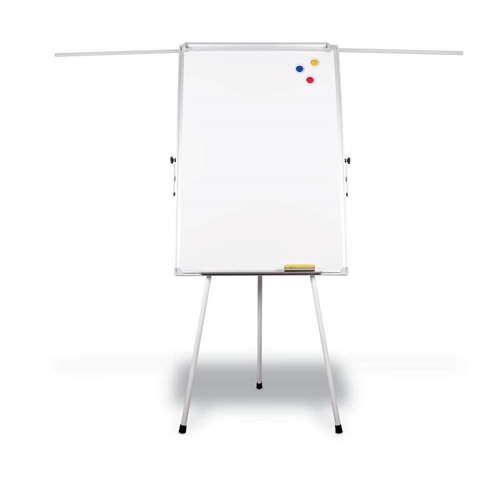 Lavagna magnetica scrivibile a secco con portablocco e comoda vaschetta portaccessori. Ganci regolabili per qualsiasi tipo di blocco e gambe telescopiche ad altezza regolabile. Prolunga bilaterale per l’esposizione di fogli singoli. Formato 70x100 cm. Colore bianco.