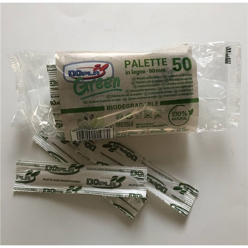 Palette caffè in legno 90 mm imbustate singolarmente. Confezione da 50 pezzi. Altezza: 9 m. Peso netto unitario: 0,70 g. Materiale: legno di betulla.