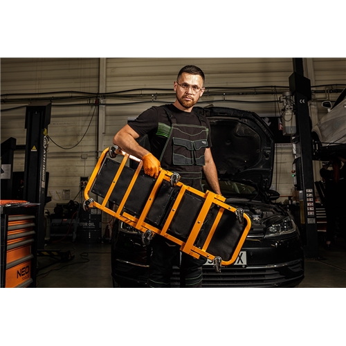Carrello sottomacchina per auto in acciaio ribaltabile 2 in 1, 11-601-1 di NEO ha la possibilità di trasformarsi in sgabello. Si tratta di una versione migliorata del noto modello, grazie a un ulteriore rinforzo sotto il poggiatesta e sotto lo schienale, alla sostituzione con ruote più grandi con un diametro di 75 mm, realizzate in polipropilene rivestito con elastomero termoplastico di poliuretano con proprietà antiolio e ammortizzanti. Il divano è inoltre dotato di rondelle aggiuntive sotto i bulloni di fissaggio delle ruote, che aumentano la resistenza del collegamento. Il rivestimento più flessibile in pelle artificiale ecologica contribuisce al comfort di utilizzo. Il divano può essere trasformato in un comodo sedile da officina con un solo movimento. Le sue dimensioni da aperto sono 40 x 14 x 102 cm, mentre da sgabello sono 54,5 x 40 x 48 cm. Il profilo del telaio è di 25 x 25 x 1 mm e la capacità di carico è di 150 kg (divano) e 120 kg (sgabello). Il prodotto del marchio NEO consente di lavorare in modo efficiente sotto l'auto, facilita le attività di officina e si rivolge a chi lavora sui veicoli a motore.