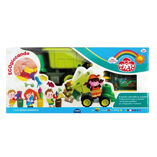 Per sensibilizzare i piccoli a prendersi cura dell'ambiente, Dido' presenta Ecogiocando: innovativo e dalla tematica attuale. Il riciclo diventa un gioco in cui si modellano gli elementi grazie alle 4 formine incluse nella confezione per poi differenziarli nei bidoncini di plastica colorati che verranno in seguito trasportati con un vero camioncino a ribalta in plastica. Sono inclusi tanti elementi in cartotecnica, operatori ecologici e un bidone dell'indifferenziata. Contenuto: 1 x camioncino; 4 x vasetti Didò da 100 g; 5 x salsicciotti da 50 g; 4 x formine; 3 x bidoncini; 1 x coltellino e mattarello; 1 x cartoncino con soggetti da montare; 1 x scatola cassonetto.