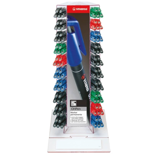 Penna OHPen ideale per lucidi e per quasi tutte le superfici lisce (cd-rom, DVD, plastica, vetro, metallo e ceramica). Impugnatura zigrinata, fondello e cappuccio ventilato con clip nel colore dell'inchiostro. Punta superfine, ampiezza di tratto 0,4 mm. Espositore composto da 150 marcatori, colori assortiti.