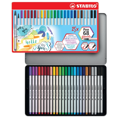 Con il pennarello Stabilo Pen 68 brush puoi controllare perfettamente i tuoi tratti, creando bellissime lettere in vero stile hand lettering. Potrai realizzare bellissime opere in modo semplice e veloce. Con la sua punta flessibile, questo pennarello si aggiunge alla famiglia Pen 68 ed è adatto sia ai principianti che agli artisti esperti. Variando la pressione sulla punta puoi usare il ''pennello'' per creare linee spesse o sottili sulla carta. Puoi creare altri effetti speciali con l'inchiostro a base d'acqua: bellissime sfumature di colore o fantastici acquarelli. Strumento ideale per decorazioni e lavori fai da te. Risultati garantiti e garanzia tedesca. Ideale per chi è alle prime armi con il brush lettering: grazie alla sua punta a pennello molto flessibile, hai subito la percezione della pressione che stai facendo. Usa la giusta pressione per disegnare line più spesse o più sottili – la punta è stata sviluppata proprio per i principianti! Per artisti più esperti, Pen 68 brush copre un ampio spettro creativo: dalle applicazioni artistiche all'ombreggiatura e all'acquarello. Combina le tue sfumature preferite e i risultati saranno unici. L'inchiostro a base d'acqua fornisce un ulteriore tocco creativo: usalo per creare fantastici effetti speciali come la fusione dei colori o gli effetti dell'acquerello Pen 68 brush dura 24 ore senza cappuccio e la punta non secca! Sviluppato da e insieme ai nostri fan - realizzato per soddisfare tutte le esigenze creative. Realizzato in Germania. Prodotto in conformità con il regolamento REACH (CE) n. 1907/2006. Prodotto in conformità con la direttiva sulla sicurezza dei giocattoli 2009/48/EC. Prodotto in conformità con la norma europea EN71 – 1, 2, 3 e 9. Marchio CE. Prodotto in conformità con la direttiva 94/62/EC sugli imballaggi e i rifiuti di imballaggio. Età consigliata: 8 anni in su. Confezione in metallo composta da 25 pezzi, colori assortiti.