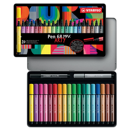 Pennarello Stabilo con punta a scalpello Pen 68 Max. Pensato per tutti quelli che amano esprimere la propria creatività con il colore utilizzando linee decise e colori forti. Punta scalpello doppia ampiezza di tratto : 1mm e 5 mm. Inchiostro a base d'acqua ideale per effetti acquarello. Non secca fno a 12 ore senza cappuccio. I colori Pen 68 Max si abbinano al 100% con i pennarelli Pen 68 e Pen 68 Brush. Colori: 768/13 Verde ghiaccio, 768/17 Eliotropo, 768/19 Porpora, 768/24 Giallo limone, 768/32 Blu oltremare, 768/33 Verde chiaro, 768/36 Verde Smeraldo, 768/43 Verde foglia, 768/44 Giallo, 768/45 Bruno, 768/46 Nero, 768/48 Carminio, 768/53 Verde turchese, 768/54 arancione, 768/56 Rosso scuro, 768/57 Azzurro, 768/58 Lilla, 768/75 Terra di Siena, 768/89 Ocra scuro, 768/95 Grigio freddo medio. Astuccio in metallo da 20 pezzi.
