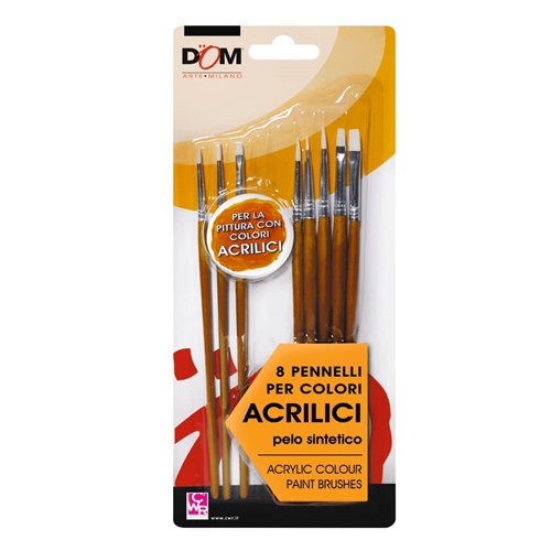 Blister composto da 8 pennelli per colori acrilici in pelo sintetico, punte e misure assortite.