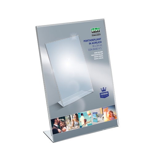 Portadepliant verticale in acrilico trasparente con base a ''L''. Formato 18x24 cm. Colore trasparente.
