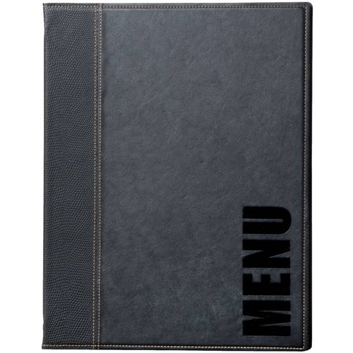 Portamenù della serie "Trendy" di Securit in formato A4. E' realizzato in similpelle ed ha una scritta stampata a rilievo. I bordi rifiniti e la sua morbidezza al tatto lo rendono un portamenù semplice ma elegante allo stesso tempo. Facile da pulire e dunque anche igienico. All’interno c'è un inserto doppio che può contenere 4 fogli A4. Gli inserti sono tenuti fermi da un elastico ed è possibile acquistarli separatamente al codice IC2987.