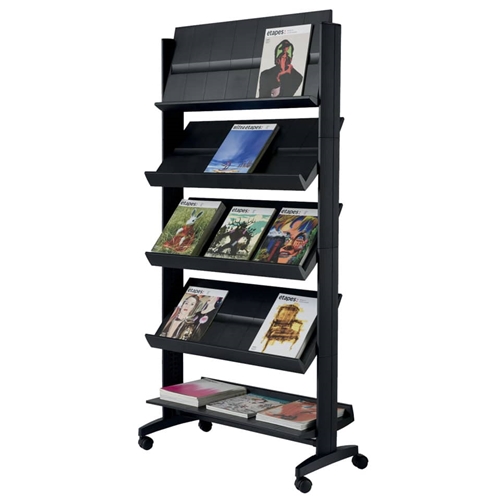 Elegante portariviste con struttura in metallo rivestita in plastica antigraffio e anticorrosione con 5 ripiani in plastica. Completa visibilità dei documenti, facile mobilità grazie alle ruote. Capacità fino a 15 documenti A4. DimensioniLxPxH) 82,5x38,2x165 cm Ripiani 75x33 cm. Colore NERO.