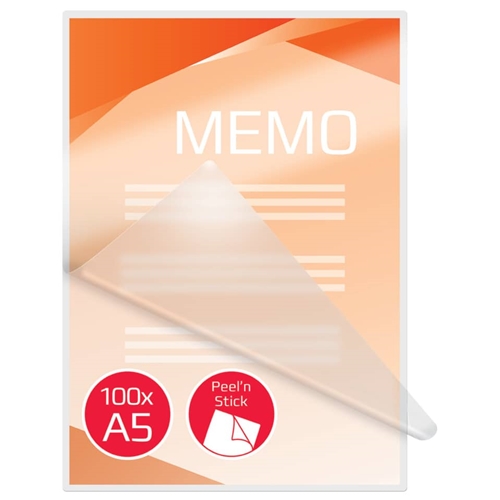 Le pouch Peel n 'Stick sono ideali per creare insegne istantanee, professionali e accattivanti. Il retro adesivo aderisce alla maggior parte dei materiali incluso vetro, metallo e cartone. Basta staccare la carta di supporto per scoprire lo strato autoadesivo. 125 micron. Finitura lucida. Formao A5. Confezione da 100.