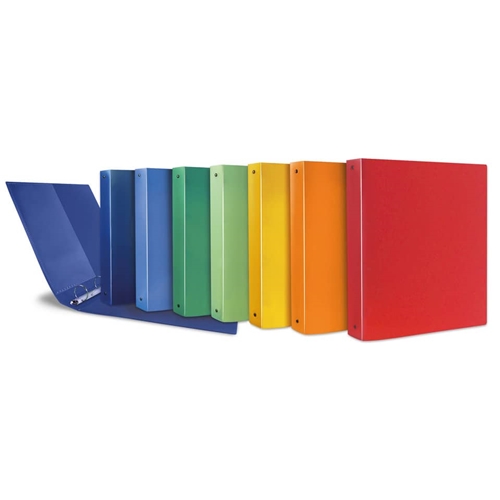 Raccoglitori in PP a lastra riciclato e riciclabile con meccanismi a 4 anelli tondi. Tasca interna. Disponibili in otto colori opachi. Formato interno 22 x 30 cm. Formato esterno 27,5 x 32 cm. Composti da 4 anelli rotondi dal diametro di 30 mm.