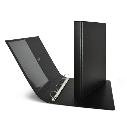 Raccoglitore in Colpan 2000® (cartone rivestito in PVC espanso) . Tasca interna trasparente. Meccanismo a 4 anelli D Ø 30 mm. Colore nero.