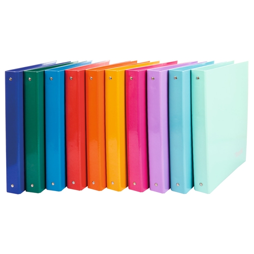 Raccoglitore in cartoncino lucido a 4 anelli tondi, diametro 30 mm. Formato: A4. Colori assortiti.