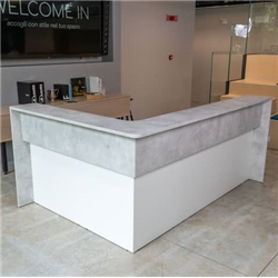 Reception angolare con scrivania 120 cm LineKit, realizzata in nobilitato melaminico e pannelli certificati FSC, con top, banner e fianchi finitori in finitura cemento e una struttura bianca.