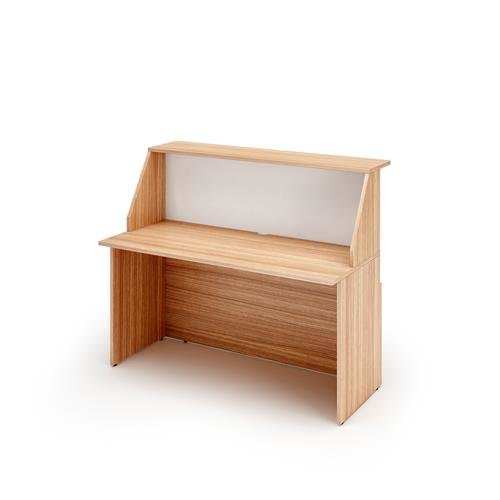 Modulo reception L140 P76 H117 cm dotato di separatori laterali sopra al desktop (sp. 18 mm, prof. 35 cm). Piano di lavoro prof. 60 cm (sp. 22 mm). Sopralzo completo di top (prof. 30 cm, sp. 22 mm). Lo spazio fra il piano di lavoro ed il top del sopralzo (H42,8 cm) permette l'alloggiamento di molti modelli di monitor. Asola passacavi sul piano di lavoro. Autoportante. Bicolore noce arabis-bianco.