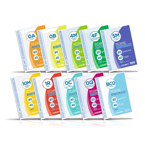 Ricambi rinforzati per quaderni ad anelli con banda rinforzata in PVC antistrappo. Sono realizzati in formato A4 in carta da 100 grammi. 40 fogli. Questo articolo è prodotto con energia solare ed è certificato Federottica.